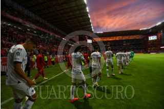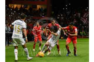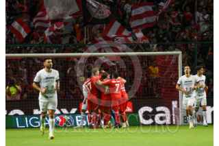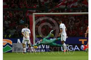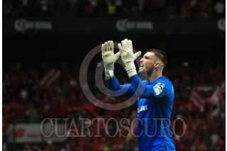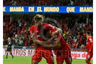 TOLUCA, ESTADO DE MÉXICO, 17MARZO2024.- Tiago Volpi portero de los Diablos de Toluca festeja su anotación ante la escuadra de PUMAS en la jornada 12 del Torneo Clausura 2024 de la Liga MX, logrando la victoria la escuadra escarlata con un marcador final 3-0. FOTO: CRISANTA ESPINOSA AGUILAR /CUARTOSCURO.COM