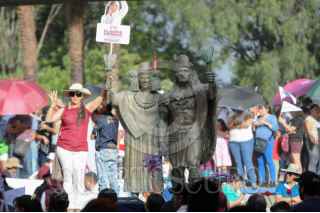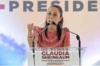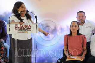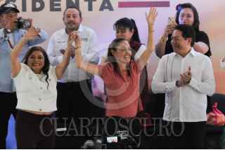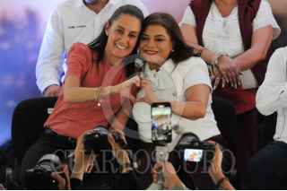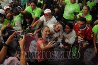 CIUDAD DE MÉXICO, 18MARZO2024. - Claudia Sheinbaum y Clara Brugada llegan al mitin en Azcapotzalco tomadas de la mano y alzando sus brazos en señal de victoria. FOTO: DANIEL AUGUSTO /CUARTOSCURO.COM