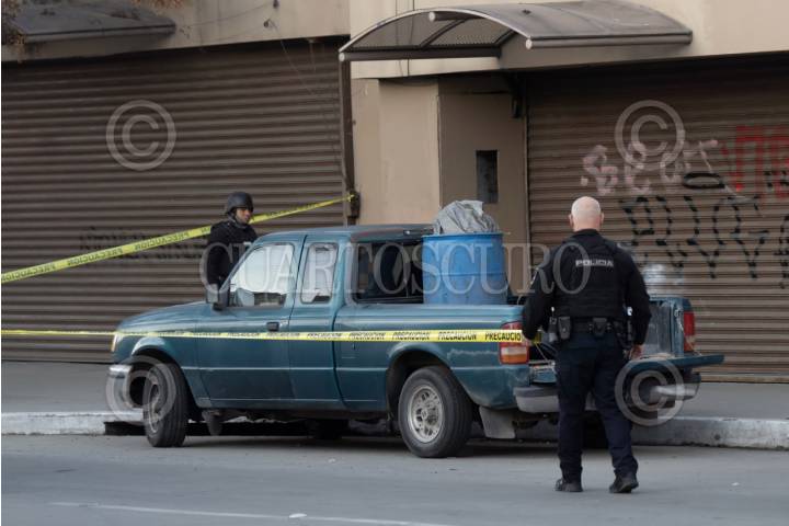 TIJUANA BAJA CALIFORNIA, 19MARZO2024.- El cuerpo de una persona fue encontrado al interior de un tambo de basura color azul sobre la avenida Madero, entre calle segunda y tercera de la Zona Centro. El tambo estaba ubicado en la parte trasera de una camioneta tipo Pick Up, Ford Ranger, con placas americanas, color verde, estacionada sobre la avenida. De acuerdo a información extraoficial, se presume que el vehículo fue abandonado en el lugar desde el viernes 15 de marzo, de la semana pasada, otro hecho se registró sobre la calle segunda, a la la altura del puente del Payaso en Zona Centro, una maleta con un cuerpo al interior fue localizado por autoridades. Este es el segundo hallazgo del día martes 19 de marzo, registrándose a tan sólo unas cuadras de donde ocurrió el hallazgo de otro cuerpo al interior de un tambo sobre la avenida Madero. De acuerdo a información extraoficial, se trata del cuerpo de una mujer el que se localizó al interior de una maleta. Elementos de la Guardia Nacional y Policías Municipales, se encuentran en el lugar, acordonando la zona. FOTO: OMAR MARTÍNEZ/CUARTOSCURO.COM