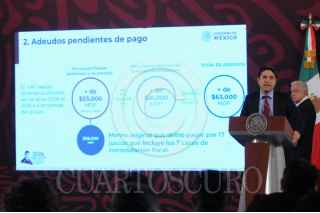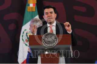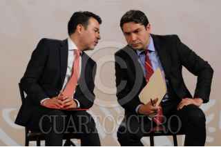 CIUDAD DE MÉXICO, 20MARZO2024.- Félix Arturo Medina, subsecretario de Gobernación y Antonio Martínez Dagnino, titular del SAT, dialogan durante la conferencia mañanera. FOTO: DANIEL AUGUSTO /CUARTOSCURO.COM
