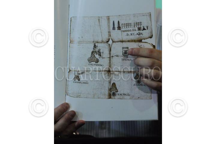 CIUDAD DE MÉXICO, 2OMARZO2024.- Muestra de uno de los Códices de San Andrés Tetepilco durante la conferencia. FOTO: DANIEL AUGUSTO /CUARTOSCURO.COM