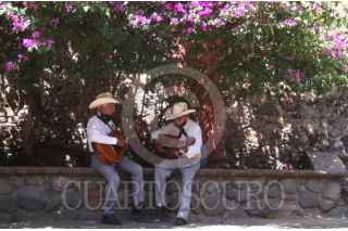 CUERNAVACA, MORELOS, 21MARZO2024.- Vida cotidiana en la calle Nezahualcóyotl en el centro de la capital de Morelos; al mediodía dos músicos ensayan una melodía bajo la fronda de una buganvilia. FOTO: MARGARITO PÉREZ RETANA / CUARTOSCURO.COM