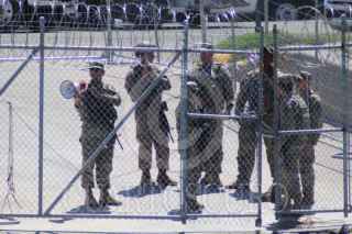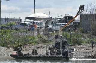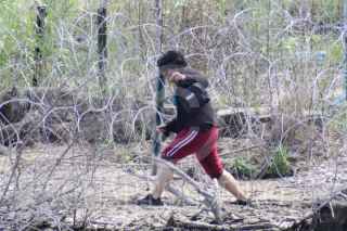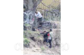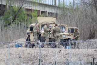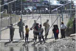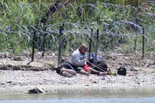PIEDRAS NEGRAS, COAHUILA, 21MARZO2024.- Un grupo de quedaron varados en el embarcadero de embarcadero de Shelby Park, sin embargo los militares estadounidenses que custodian la alambrada en Eagle Pass no los dejaron pasar, al contrario de forma irónica con altavoz les dicen en español que si quieren agua, trabajo o ayuda lo pidan en México y no en su país. Desde lado mexicano se observa a las personas que no pudieron ingresas a los Estados Unidos sentadas junto a la alambrada em espera de poder ingresar. FOTO: CUARTOSCURO.COM