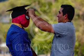 CIUDAD DE MÉXICO, 22MARZO2024.- Un estudiante se colocó una máscara del hombre araña para tomarse la foto de graduación en Ciudad Universitaria. FOTOS: ROGELIO MORALES /CUARTOSCURO.COM