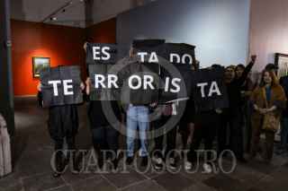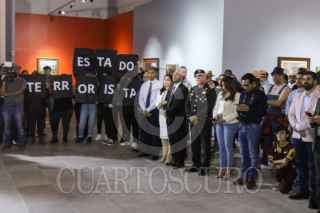 ZACATECAS, ZACATECAS, 23MARZO2024.- Como parte de la inauguración oficial del Festival Cultural Zacatecas 2024, fue presentada en el ex Templo de San Agustín la exposición: "Poética de la contemplación. Maestros paisajistas del Museo Nacional de Arte"; una colectiva de mujeres se manifestó con la consigna "Estado terrorista" y exigieron la renuncia de Rodrigo Reyes, secretario de Gobierno del Estado, a quien responsabilizan del operativo policiaco del 8M, en el que hubo uso excesivo de la fuerza y fueron detenidas por lo menos una docena de mujeres. FOTO: ADOLFO VLADIMIR /CUARTOSCURO.COM