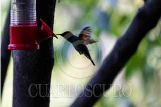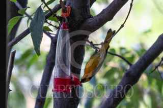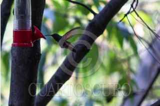 CIUDAD DE MÉXICO, 28MARZO2024.- Diversas especies de aves de la ciudad buscan como hidratarse en la ciudad ante el intenso calor que se ha dejado sentir. . Personas colocan dispensadores de agua en árboles que aprovechan estas especies para lograr sobrevivir. En la imagen colibríes y un Benteveo buscan el vital líquido. FOTO: MOISÉS PABLO/CUARTOSCURO.COM