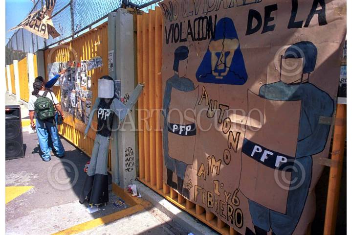 Alejandro Echavarria alias "El Mosh" estuvo presente esta tarde durante la toma de la preparatoria numero 3, por la conmemoracion de un año de su ocupacion por parte de la PFP. FOTO: Pedro Mera/CUARTOSCURO.COM