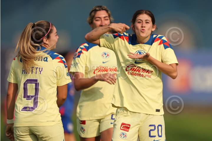CIUDAD DE MÉXICO, 29MARZO2024. Festejo de la jugadora Nicolette Hernández durante el partido de fútbol Cruz Azul vs América correspondiente a la jornada 13 del Torneo Clausura 2024 de Liga BBVA MX Femenil, en instalaciones de La Noria. FOTO: EDGAR NEGRETE/CUARTOSCURO.COM