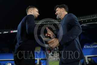 CIUDAD DE MÉXICO, 30MARZO2024. Los Directores Técnicos Martín Anselmi y Gustavo Lema se dan la mano previo al partido de fútbol Pumas vs Cruz Azul correspondiente a la jornada 13 del Torneo Clausura 2024 de Liga BBVA MX, en el Estadio Olímpico Universitario. FOTO: EDGAR NEGRETE LIRA/CUARTOSCURO.COM