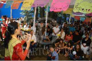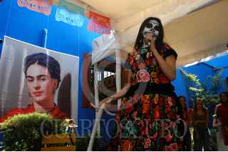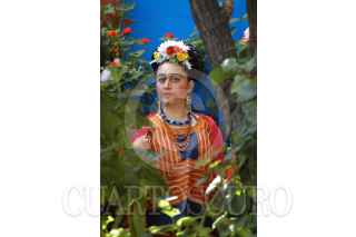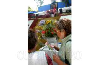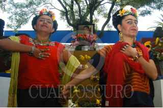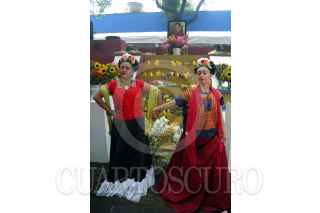 MÉXICO D.F. 06JULIO2007.-Se llevo acabo la celebración del 100 aniversario del natalicio de la pintora Frida Kahlo, esto en la Casa Azul.En la imagen unas asistenetes colocan flores en un pequeño altar realizado en honor de la pintora. FOTO: GUILLERMO PEREA/CUARTOSCURO.COM