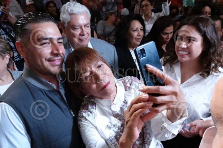 CIUDAD DE MÉXICO, 03ABRIL2024.- Caty Monreal, candidata a la alcaldía Cuauhtémoc, y Omar García Harfuch, candidato a senador, se tomaron selfies con vecinos de esta demarcación durante su llegada a una Asamblea en la Plaza Renato Leduc. FOTO: GRACIELA LÓPEZ /CUARTOSCURO.COM