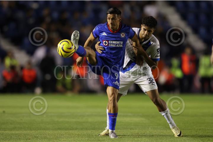 CIUDAD DE MÉXICO, 06ABRIL2024. Ángel Sepúlveda de la Maquina Celeste y Antonio Leone de Rayados disputan una pelota durante el partido de fútbol Cruz Azul vs Monterrey correspondiente a la jornada 14 del Torneo Clausura 2024 de Liga BBVA MX, en el Estadio Ciudad de los Deportes. FOTO: EDGAR NEGRETE LIRA/CUARTOSCURO.COM