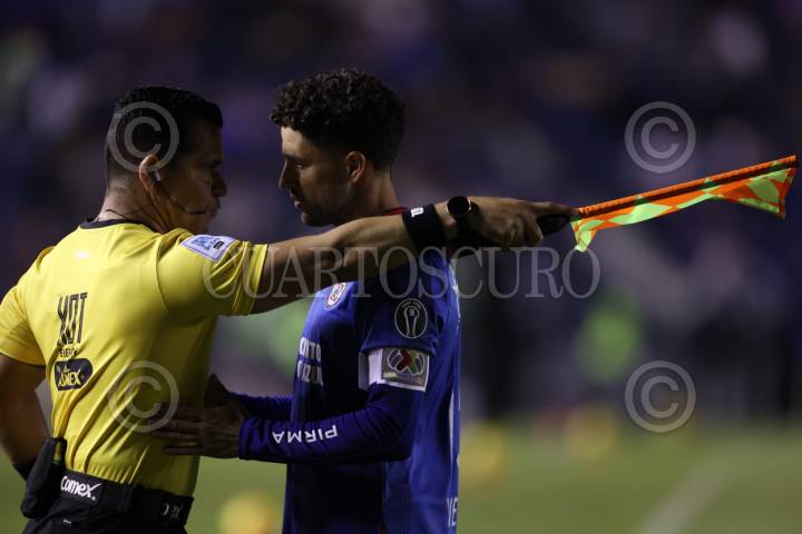 CIUDAD DE MÉXICO, 06ABRIL2024. El jugador José Ignacio Rivero reclama al árbitro asistente Marco Antonio Bisguerra por un gol anulado durante el partido de fútbol Cruz Azul vs Monterrey correspondiente a la jornada 14 del Torneo Clausura 2024 de Liga BBVA MX, en el Estadio Ciudad de los Deportes. FOTO: EDGAR NEGRETE LIRA/CUARTOSCURO.COM