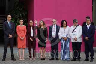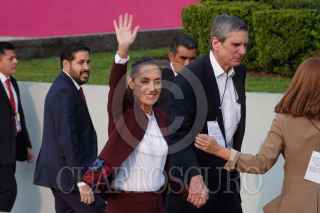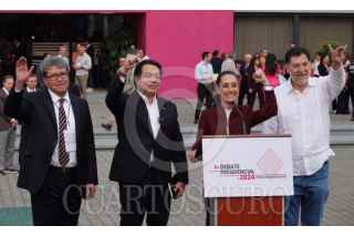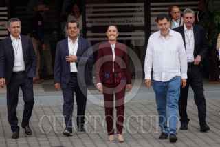 CIUDAD DE MÉXICO, 07ABRIL2024.- César Yañez, coordinador General de Política y Gobierno de la Presidencia; el diputado Sergio Gutiérrez Luna, Claudia Sheinbaum, candidata a la presidencia de la República Mexicana; Gerardo Fernández Noroña, vocero de campaña, y Jesús María Tarriba, esposo de Claudia Sheinbaum, durante su llegada al primer debate presidencial en las instalaciones del Instituto Nacional Electoral. FOTO: GRACIELA LÓPEZ /CUARTOSCURO.COM