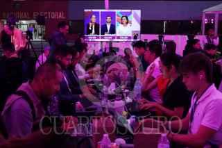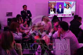 CIUDAD DE MÉXICO, 07ABRIL2024.- Periodistas observan el primer debate presidencial entre los candidatos Claudia Sheinbaum, Jorge Álvarez Máynez, y Xóchitl Gálvez, en las instalaciones del Instituto Nacional Electoral. FOTO: GRACIELA LÓPEZ /CUARTOSCURO.COM