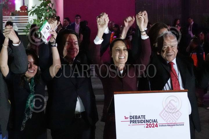 CIUDAD DE MÉXICO, 07ABRIL2024.- Mario Delgado, presidente de Morena, y Claudia Sheinbaum, candidata a la presidencia por Morena, durante su salida del primer debate presidencial en las instalaciones del Instituto Nacional Electoral. FOTO: GRACIELA LÓPEZ /CUARTOSCURO.COM