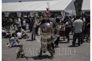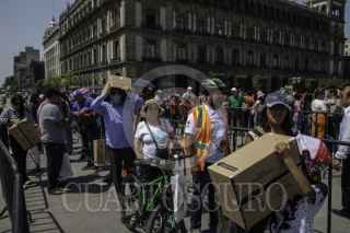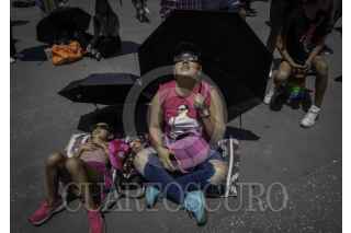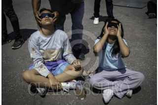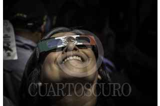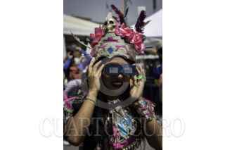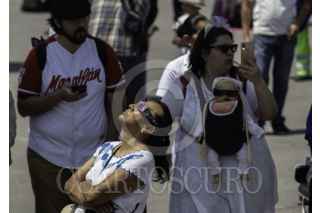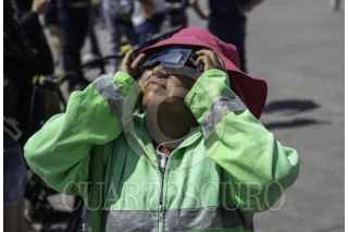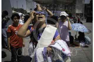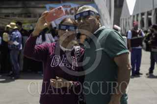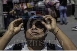 CIUDAD DE MÉXICO, 08ABRIL2024.- Decenas de capitalinos se reunieron en la plancha del Zócalo para ver el Eclipse solar que se pudo apreciar con un 70?sde la Ciudad de México. FOTO: ANDREA MURCIA /CUARTOSCURO.COM