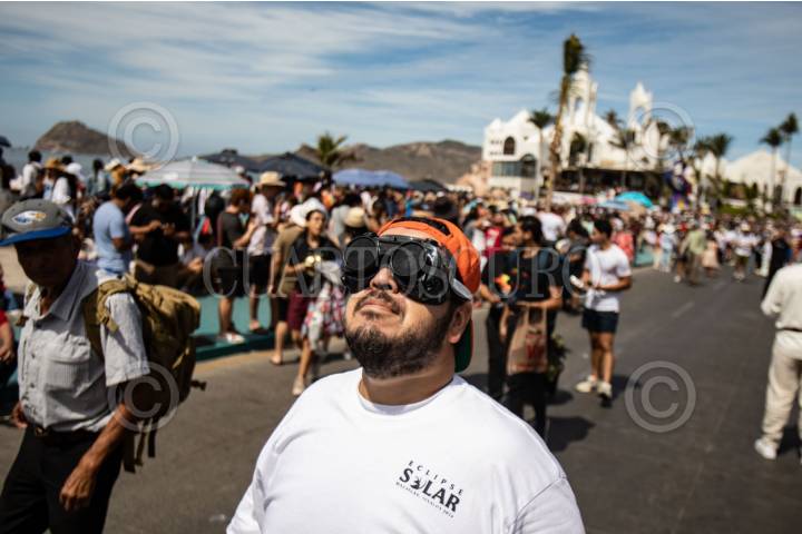 MAZATLÁN, SINALOA, 08ABRIL2024.- Miles de personas disfrutaron del eclipse total de sol sobre la Av. del Mar y esquina con Av. Rafael Buelna, en el malecón de Mazatlán. Las calles y playas se mostraron abarrotadas por turismo de varios estados del país y extranjeros, quienes estuvieron desde el comienzo hasta el final del fenómeno astronómico. FOTO: ADOLFO VLADIMIR /CUARTOSCURO.COM