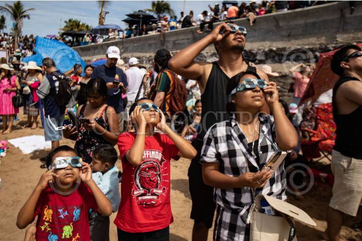 MAZATLÁN, SINALOA, 08ABRIL2024.- Miles de personas disfrutaron del eclipse total de sol sobre la Av. del Mar y esquina con Av. Rafael Buelna, en el malecón de Mazatlán. Las calles y playas se mostraron abarrotadas por turismo de varios estados del país y extranjeros, quienes estuvieron desde el comienzo hasta el final del fenómeno astronómico. FOTO: ADOLFO VLADIMIR /CUARTOSCURO.COM