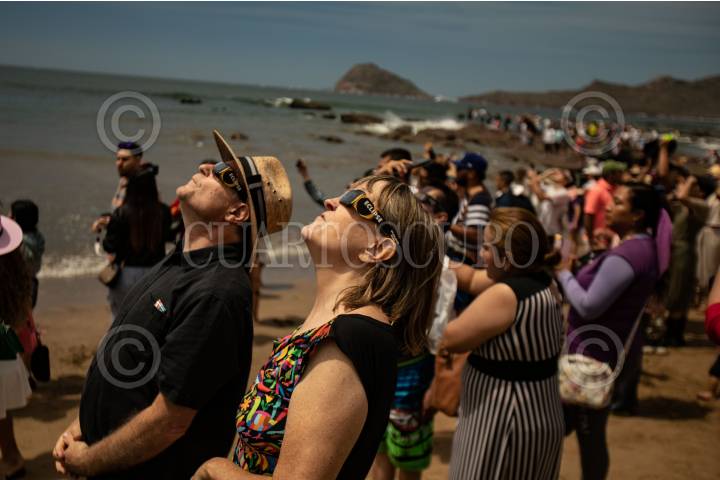 MAZATLÁN, SINALOA, 08ABRIL2024.- Miles de personas disfrutaron del eclipse total de sol sobre la Av. del Mar y esquina con Av. Rafael Buelna, en el malecón de Mazatlán. Las calles y playas se mostraron abarrotadas por turismo de varios estados del país y extranjeros, quienes estuvieron desde el comienzo hasta el final del fenómeno astronómico. FOTO: ADOLFO VLADIMIR /CUARTOSCURO.COM