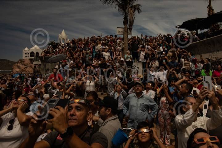 MAZATLÁN, SINALOA, 08ABRIL2024.- Miles de personas disfrutaron del eclipse total de sol sobre la Av. del Mar y esquina con Av. Rafael Buelna, en el malecón de Mazatlán. Las calles y playas se mostraron abarrotadas por turismo de varios estados del país y extranjeros, quienes estuvieron desde el comienzo hasta el final del fenómeno astronómico. FOTO: ADOLFO VLADIMIR /CUARTOSCURO.COM