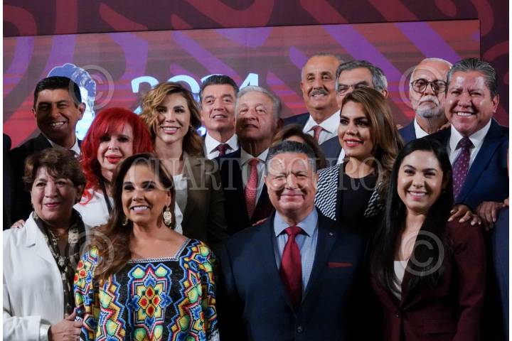 CIUDAD DE MÉXICO, 09ABRIL2024.- Andrés Manuel López Obrador, presidente de México, se fotografió con las y los gobernadores de los 23 estados que integran la red del programa IMSS-BIENESTAR tras la conferencia matutina. FOTO: GALO CAÑAS/CUARTOSCURO.COM