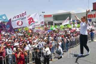 LA MAGDALENA ATLICPAC, ESTADO DE MÉXICO, 09ABRIL2024.- Simpatizantes observan desde un puente peatonal el mitin de Claudia Sheinbaum, candidata a la presidencia por la coalición "Sigamos Haciendo Historia (PT, PVEM y Morena), realizado Geovillas San Jacinto. FOTO: MARIO JASSO/CUARTOSCURO.COM