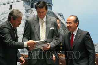MÉXICO, D.F. 13JULIO2007.- El presidente Felipe Calderón Hinojosa, encabezó la cremonia de cancelación del timbre postal de Chichén Itzá. En la imagen con el gobernador de Yucatán Patricio Patrón Lavada y Rodolfo Elizondo, secretario de turismo. FOTO: PAOLA HIDALGO/CUARTOSCURO.COM