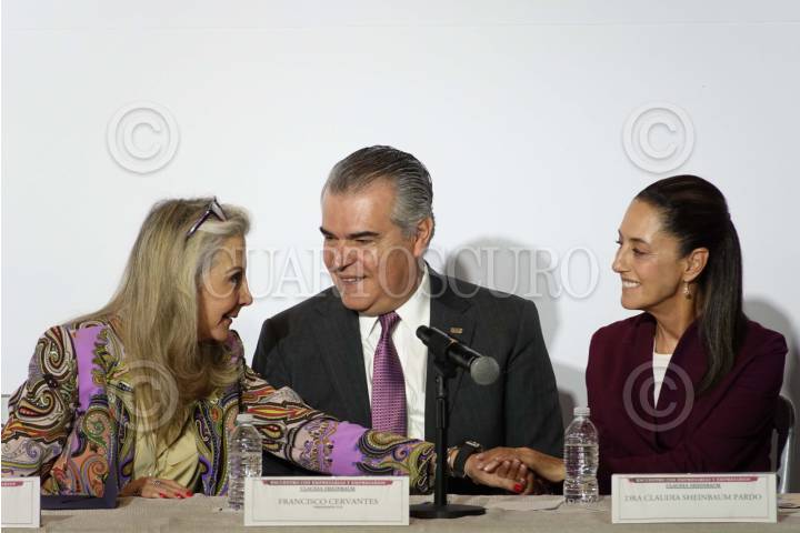 CIUDAD DE MÉXICO, 15ABRIL2024.- Gina Diez Barroso, fundadora de Centro y Dalia Empower; Francisco Cervantes, presidente del Consejo Coordinador Empresarial, y Claudia Sheinbaum, candidata a la presidencia por Morena,, durante una reunión con Empresarias y Empresarios en el Hotel Hilton. FOTO: GRACIELA LÓPEZ /CUARTOSCURO.COM
