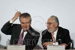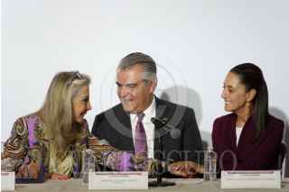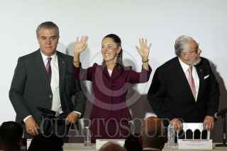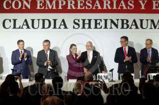 CIUDAD DE MÉXICO, 15ABRIL2024.- Francisco Cervantes; presidente de Consejo Coordinador Empresarial; Claudia Sheinbaum, candidata a la presidencia por Morena, y Alejandro Malagón, presidente de la Concamin, durante una reunión con Empresarias y Empresarios en el Hotel Hilton. FOTO: GRACIELA LÓPEZ /CUARTOSCURO.COM
