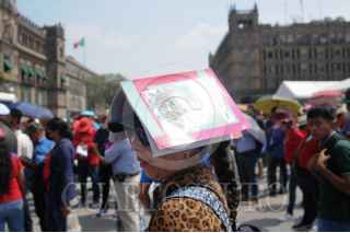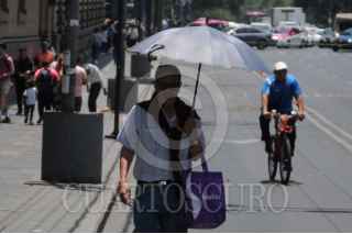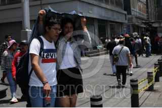 CIUDAD DE MÉXICO, 15ABRIL2024. - Una pareja camina por el Centro Histórico protegiendose del sol con una chamarra, las altas temperaturas en la ciudad alcanzaron los 33 grados. FOTO: DANIEL AUGUSTO /CUARTOSCURO.COM