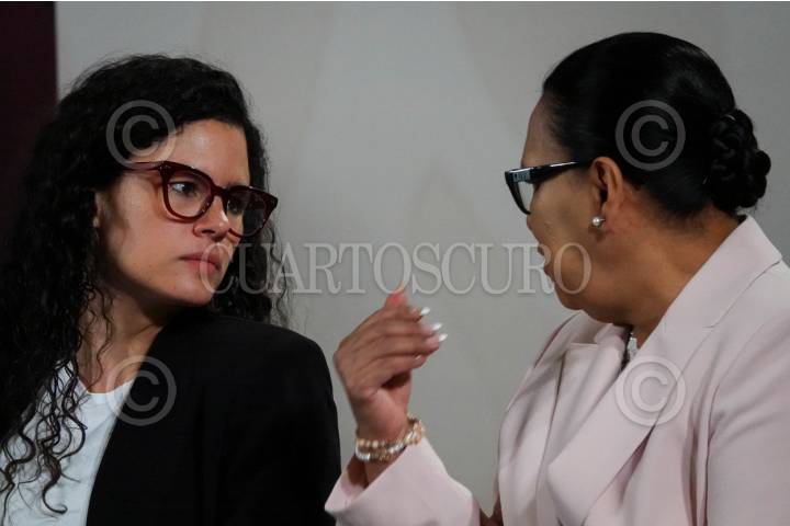 CIUDAD DE MÉXICO, 16ABRIL2024.- Luisa María Alcalde, secretaria de Gobernación, conversa con Rosa Icela Rodríguez, secretaria de Seguridad Pública, durante la conferencia de prensa matutina desde Palacio Nacional. FOTO: GALO CAÑAS/CUARTOSCURO.COM