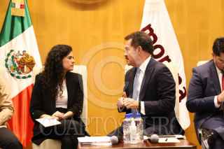 CIUDAD DE MÉXICO, 16ABRIL2024.- Luisa María Alcalde, secretaria de Gobernación, e Ignacio Mier, diputado y coordinador de morena, durante la reunión privada del Grupo Parlamentario de Morena, para el análisis de la propuesta de creación del Fondo para Pensiones del Bienestar. Estuvieron presentes: Zoé Robledo, director general del IMSS; Bertha María Alcalde, directora general del ISSSTE, y Carlos Martínez V. director del INFONAVIT. FOTO: DIPUTADOS MORENA/CUARTOSCURO.COM