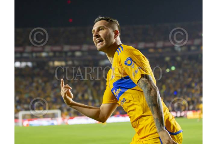 SAN NICOLÁS DE LOS GARZA, NUEVO LEÓN, 20ABRIL2024.- André-Pierre Gignac de Tigres, festeja el gol ante el Necaxa, en el estadio Universitario, partido correspondiente a la jornada 16 de la Clausura 2024 de la Liga MX. Marcador Final: Tigres: 5 - Necaxa: 2. FOTO: GABRIELA PÉREZ MONTIEL / CUARTOSCURO.COM