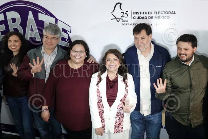 CIUDAD DE MÉXICO, 21ABRIL2024.- Clara Brugada, candidata a Jefa de Gobierno, acompañada de Citlalli Hernández, secretaria de Morena, el diputado Gerardo Fernández Noroña y Sebastián Ramírez, presidente de Morena, durante la salida del Segundo Debate Chilango en las instalaciones del Grupo MVS. FOTO: GRACIELA LÓPEZ /CUARTOSCURO.COM