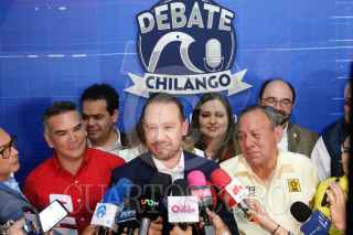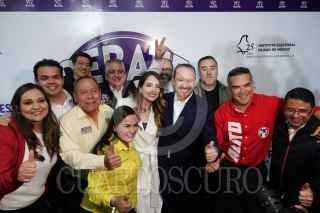 CIUDAD DE MÉXICO, 21ABRIL2024.- Santiago Taboada, candidato a Jefe de Gobierno por el PRI-PAN-PRD, acompañado de su esposa Fernanda Chávez, Jesús Zambrano, presidente del PRD, y Alejandro Moreno, presidente del PRI, durante su salida del Segundo Debate Chilango en las instalaciones del Grupo MVS. FOTO: GRACIELA LÓPEZ /CUARTOSCURO.COM