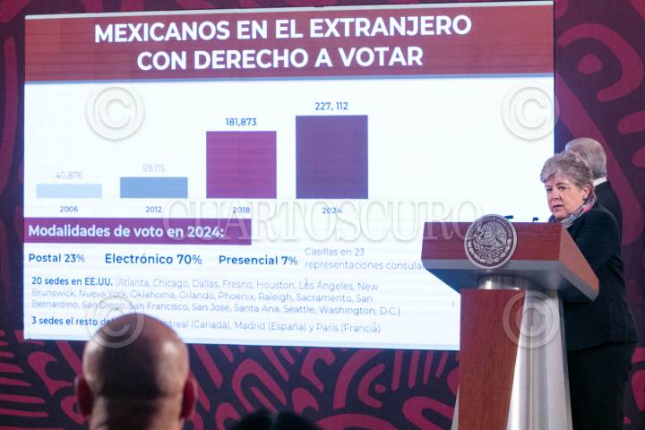CIUDAD DE MÉXICO, 22ABRIL2024.- Alicia Bárcena, secretario de Relaciones Exteriores, habló sobre las acciones para garantizar el derecho al voto en el extranjero, aclaro que la cancillería a través de sus consulados están apoyando a los migrantes, sobre todo en Estados Unidos, para que puedan obtener su credencial y si poder votar el 2 de junio. FOTO: MOISÉS PABLO/CUARTOSCURO.COM