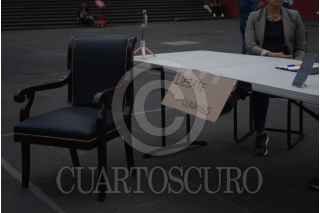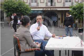 XALAPA, VERACRUZ, 22ABRIL2024.- El candidato a diputado federal por “Fuerza y Corazón por Veracruz”, Américo Zúñiga, colocó una mesa en la plaza Lerdo para pedir a los ciudadanos que debatieran con él. Acusó que ninguno de sus contrincantes ha querido debatir con él, rumbo a la contienda electoral. FOTO: YERANIA ROLÓN/CUARTOSCURO.COM