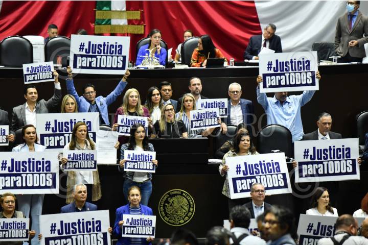 CIUDAD DE MÉXICO, 24ABRIL2024.- Lizbeth Mata Lozano, diputada del PAN, e integrantes de su grupo parlamentario, sostienen cartulinas con la frase "#Justiciaparatodos" para manifestarse en contra de la Ley de Amnistía en materia de suspensión del acto reclamado e inconstitucionalidad de normas generales durante la sesión semipresencial de la Cámara de Diputados. FOTO: MARIO JASSO/CUARTOSCURO.COM