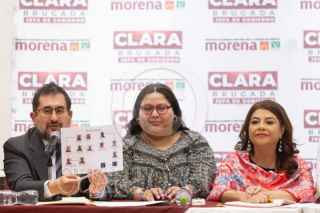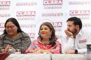 CIUDAD DE MÉXICO, 25ABRIL2024.- Clara Brugada, candidata a la jefatura de Gobierno por la coalición "Sigamos haciendo historia" (Morena, PT, y PVEM), ofreció conferencia para describir como “excesivas” las medidas cautelares que concedió la Comisión Permanente de Quejas del Instituto Electoral de la Ciudad de México (IECM) de no difundir ninguna calumnia o acusación en contra Santiago Taboada, candidato a la jefatura de gobierno por la coalición "Va por la CDMX". Estuvo acompañada por: Citlalli Hernández, secretaria general de Morena, y Sebastián Ramírez, presidente de Morena en la Ciudad de México. FOTO: PRENSA CLARA BRUGADA/CUARTOSCURO.COM