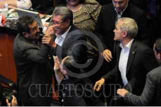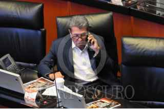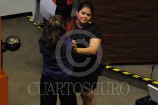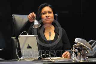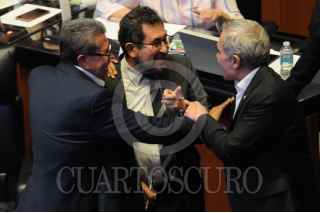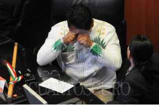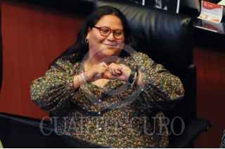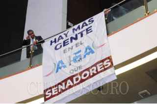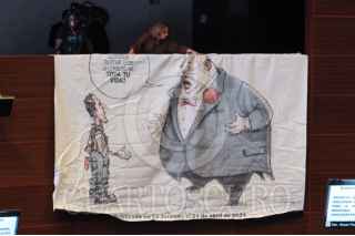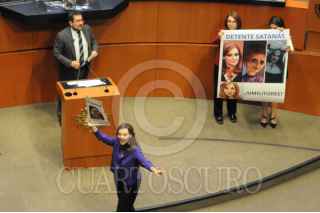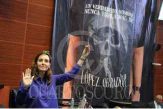 CIUDAD DE MÉXICO, 25ABRIL2024. - Los senadores panistas colocaron una manta con la publicación que en días anteriores publicó el partido Morena en su cuenta de "X", la publicación muestra una playera con la leyenda "Un verdadero hombre no habla mal de López Obrador" más la figura de la Santa Muerte, frente a la manta, Lilly Telléz posa frente a las cámaras con un rosario en la mano. FOTO: DANIEL AUGUSTO /CUARTOSCURO.COM