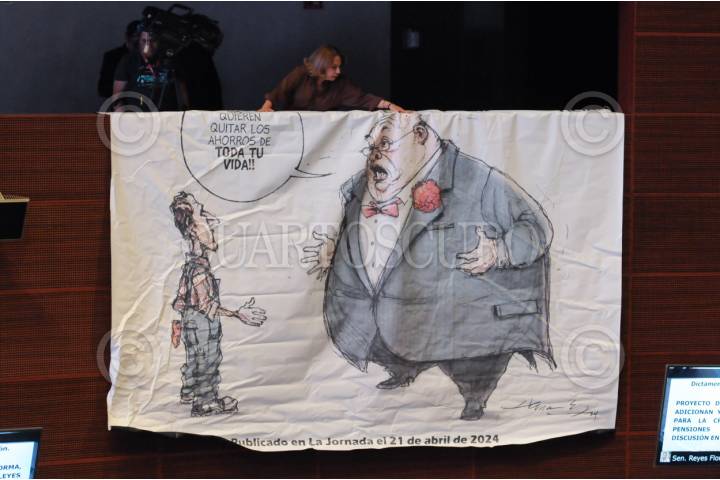 CIUDAD DE MÉXICO, 25ABRIL2024. - Los morenistas desplegaron una manta en torno a la discusión de la reforma de Afores. FOTO: DANIEL AUGUSTO /CUARTOSCURO.COM