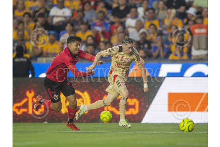 SAN NICOLÁS DE LOS GARZA, NUEVO LEÓN, 27ABRIL2024.- Marcelo Flores de Tigres, se disputa el balón con Domingo Blanco de Xolos de Tijuana, en el estadio Universitario, partido correspondiente a la jornada 17 de la Clausura 2024, Liga MX. Marcador Final: Tigres: 4 - Xolos: 1. FOTO: GABRIELA PÉREZ MONTIEL / CUARTOSCURO.COM