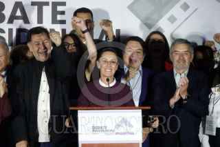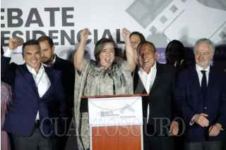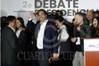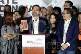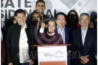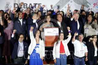 CIUDAD DE MÉXICO, 28ABRIL2024.- Xóchitl Gálvez, candidata a la presidencia por la coalición "Fuerza y Corazón por México", acompañada de Marko Cortés, presidente del PAN, Alejandro Moreno, presidente del PRI, Jesús Zambrano, presidente del PRD, y otros militantes, durante su salida en el Segundo Debate Presidencial en las instalaciones de Estudios Churubusco. FOTO: GRACIELA LÓPEZ /CUARTOSCURO.COM