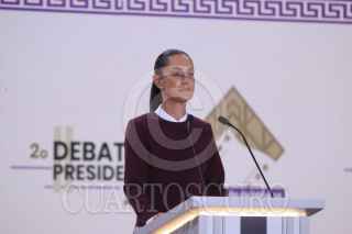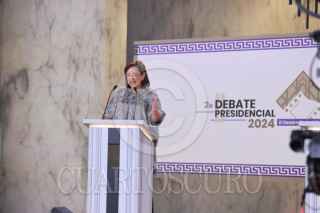 CIUDAD DE MÉXICO, 28ABRIL2024.- Las candidatas y el candidato presidencial; Claudia Sheinbaum, Xóchitl Gálvez, y Jorge Álvarez Máynez, durante el segundo debate presidencial que en esta ocasión se llevó a cabo en las instalaciones de los Estudios Churubusco. FOTO: INE/CUARTOSCURO.COM