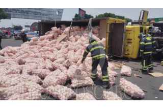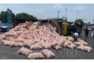 CIUDAD DE MÉXICO,, 28ABRIL2024.- Un camión de carga que transportaba 22 toneladas de cebolla volcó en el circuito de Frutas y Legumbres de la Central de Abastos, bomberos atendieron la emergencia. Primero fue retirada toda la cebolla para poder incorporar a la pesada unidad, no hubo lesionados de gravedad. FOTO: CUARTOSCURO.COM