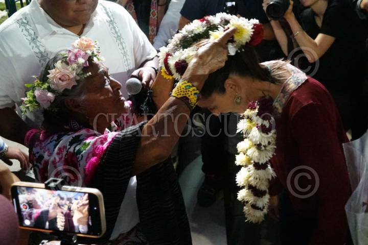 CIUDAD DE MÉXICO, 29ABRIL2024.- Claudia Sheinbaum, candidata a la presidencia, recibió una corona de flores durante un mitin en la explanada de la alcaldía Xochimilco. FOTO: GRACIELA LÓPEZ /CUARTOSCURO.COM