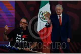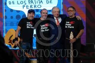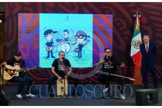 CIUDAD DE MÉXICO, 30ABRIL2024.- Andrés Manuel López Obrador, presidente de México, disfruta del pequeño concierto con motivo del Día de la Niñez ofrecido por el grupo de rock infantil “Los Patita de Perro”, Previo al arranque del informe de seguridad en la conferencia matutina. FOTO: GALO CAÑAS/CUARTOSCURO.COM