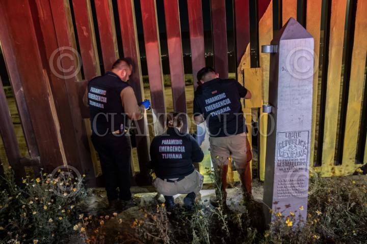 TIJUANA BAJA CALIFORNIA, 30ABRIL2024.- Tres mujeres migrantes de origen ecuatoriano y colombiano, cayeron del muro fronterizo tras intentar cruzar a Estados Unidos durante la noche del lunes 29 de abril. Paramédicos de la Cruz Roja Mexicana recibieron tres reportes sobre el incidente a través del numero de emergencias, donde los reportantes expresaban que las mujeres se encontraban a la altura de la colonia El Soler. Tras llegar al lugar sobre la Avenida Internacional, frente a la gasera Silza, encontraron a las mujeres sobre el suelo ya del lado americano con algunas lesiones y fracturas, una de ellas en estado grave. La mujer colombiana pudo acercarse al muro y sacar su pie para ser auxiliada por paramédicos mexicanos, sin embargo a las otras dos mujeres ecuatorianas que cayeron a unos metros del muro no les fue posible acercarse por sus lesiones. Después de mas de 40 minutos de espera, elementos de Border Patrol y paramédicos llegaron al lugar para atender a las migrantes desde el lado americano para después trasladarlas a bordo de unidades tipo Pick up de la patrulla fronteriza. FOTO: OMAR MARTÍNEZ/CUARTOSCURO.COM