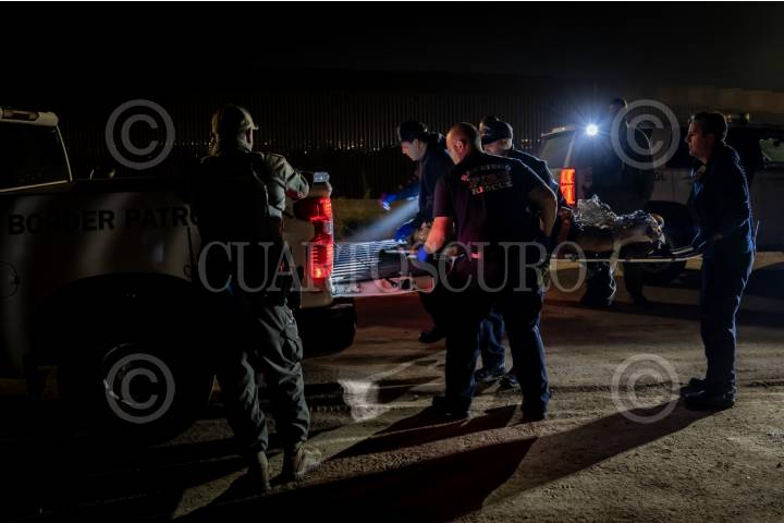 TIJUANA BAJA CALIFORNIA, 30ABRIL2024.- Tres mujeres migrantes de origen ecuatoriano y colombiano, cayeron del muro fronterizo tras intentar cruzar a Estados Unidos durante la noche del lunes 29 de abril. Paramédicos de la Cruz Roja Mexicana recibieron tres reportes sobre el incidente a través del numero de emergencias, donde los reportantes expresaban que las mujeres se encontraban a la altura de la colonia El Soler. Tras llegar al lugar sobre la Avenida Internacional, frente a la gasera Silza, encontraron a las mujeres sobre el suelo ya del lado americano con algunas lesiones y fracturas, una de ellas en estado grave. La mujer colombiana pudo acercarse al muro y sacar su pie para ser auxiliada por paramédicos mexicanos, sin embargo a las otras dos mujeres ecuatorianas que cayeron a unos metros del muro no les fue posible acercarse por sus lesiones. Después de mas de 40 minutos de espera, elementos de Border Patrol y paramédicos llegaron al lugar para atender a las migrantes desde el lado americano para después trasladarlas a bordo de unidades tipo Pick up de la patrulla fronteriza. FOTO: OMAR MARTÍNEZ/CUARTOSCURO.COM